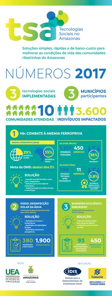 Aplicado a partir de março de 2017, o projeto Tecnologias Sociais no Amazonas (TSA) alcançou, em menos de um ano, números que mostram que estamos no caminho certo para alcançar o objetivo proposto: melhorar as condições de vida das comunidades da região amazônica. O projeto, desenvolvido pelo IDIS, foi implementado em parceria com a Universidade Estadual do Amazonas, Secretaria de Saúde do Amazonas e os governos locais, e financiado pela Fundação Banco do Brasil.